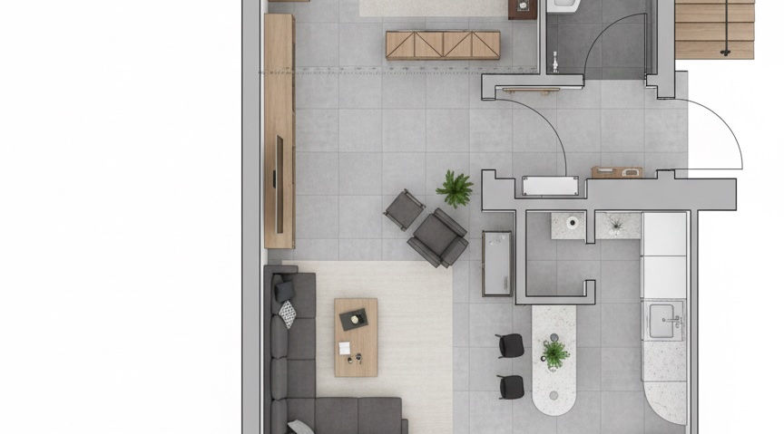 Der offen gestaltete Grundriss schafft ein modernes, luftiges Wohnkonzept. Küche, Wohn- und Schlafbereich gehen fließend ineinander über und bieten viel Raum für individuelle Gestaltungsideen.